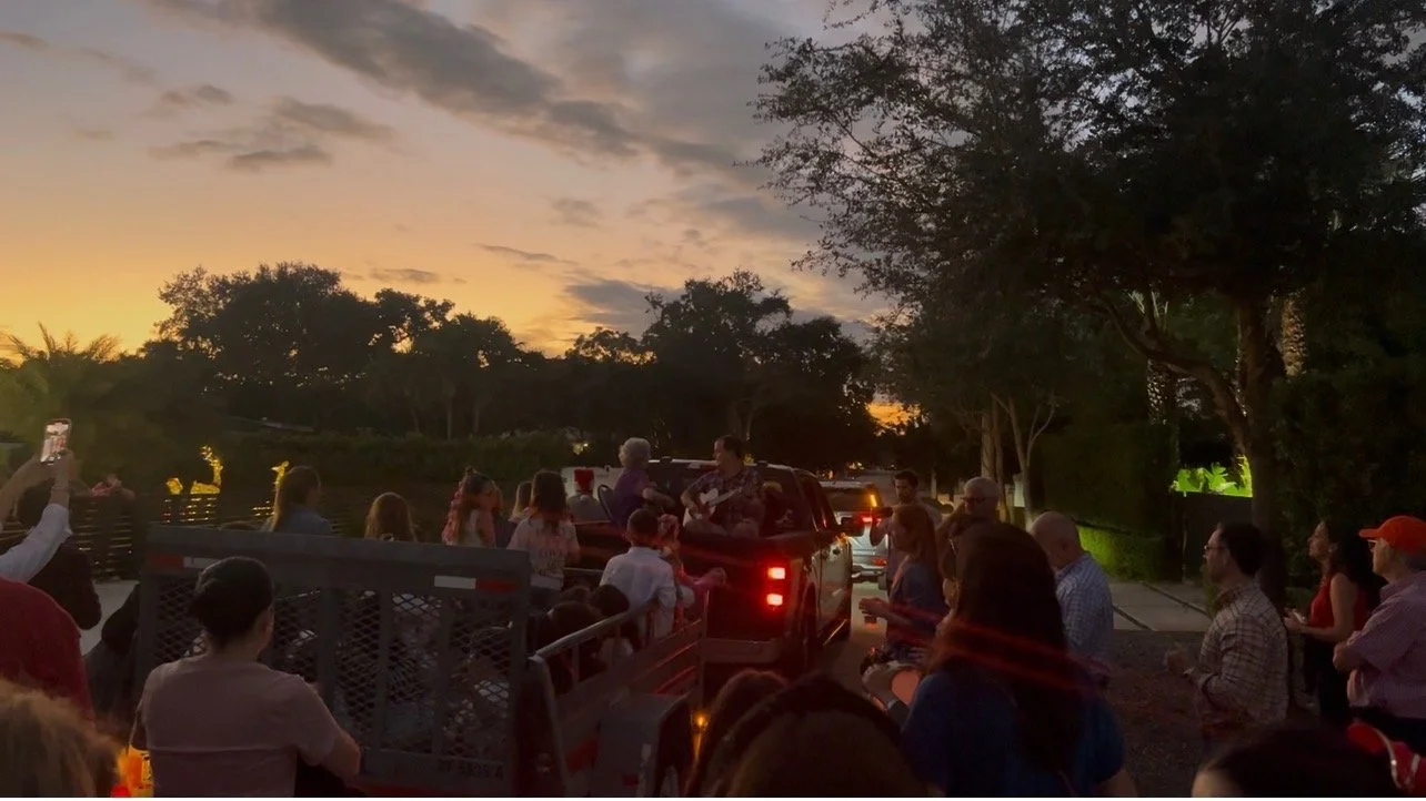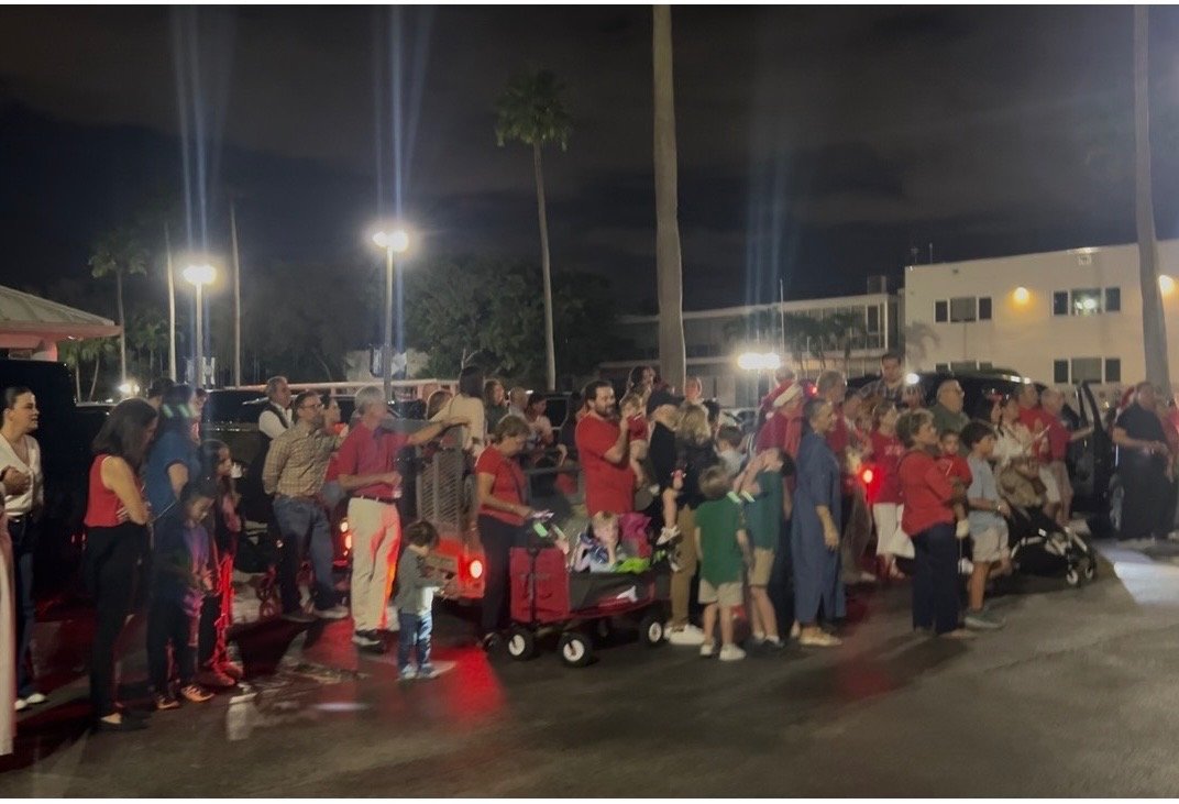 The Miami Chapter is grateful to Carlotica and Alfonso Ledo for hosting numerous ACU families and friends at their home for Christmas Caroling. The evening began by meeting at the Ledo residence where the group warmed up their voices! Approximately 90 individuals attended this joyous event, including adults and children. Everyone then began walking toward St. Thomas the Apostle Catholic Church, which is just a few blocks from the Ledo residence. The children were seated in a flatbad trailer lined with bales of hay and the entire group sang Christmas en route to the Church to greet the parishioners. After the event, everyone reconvened at the Ledo residence for a potluck meal.