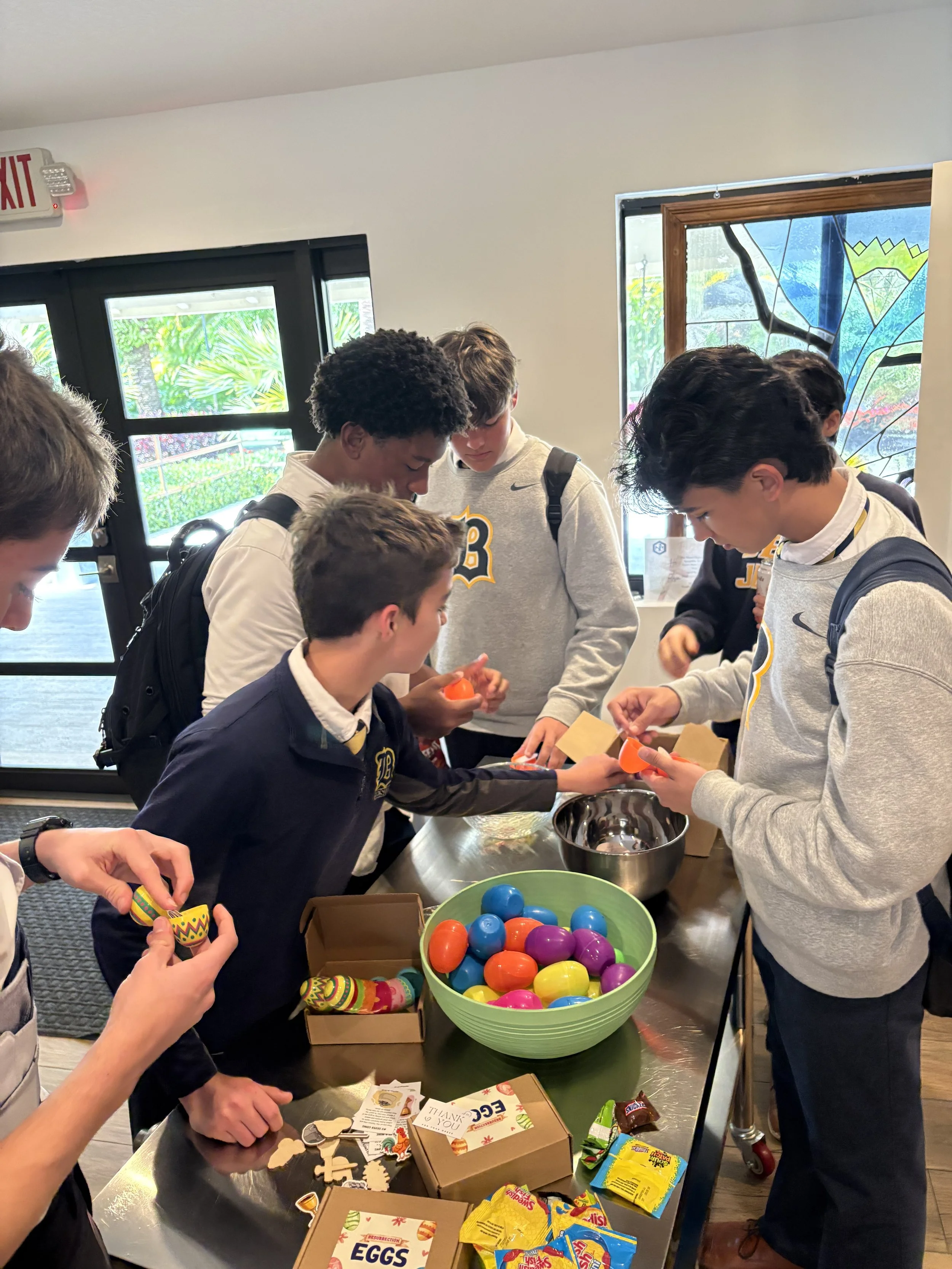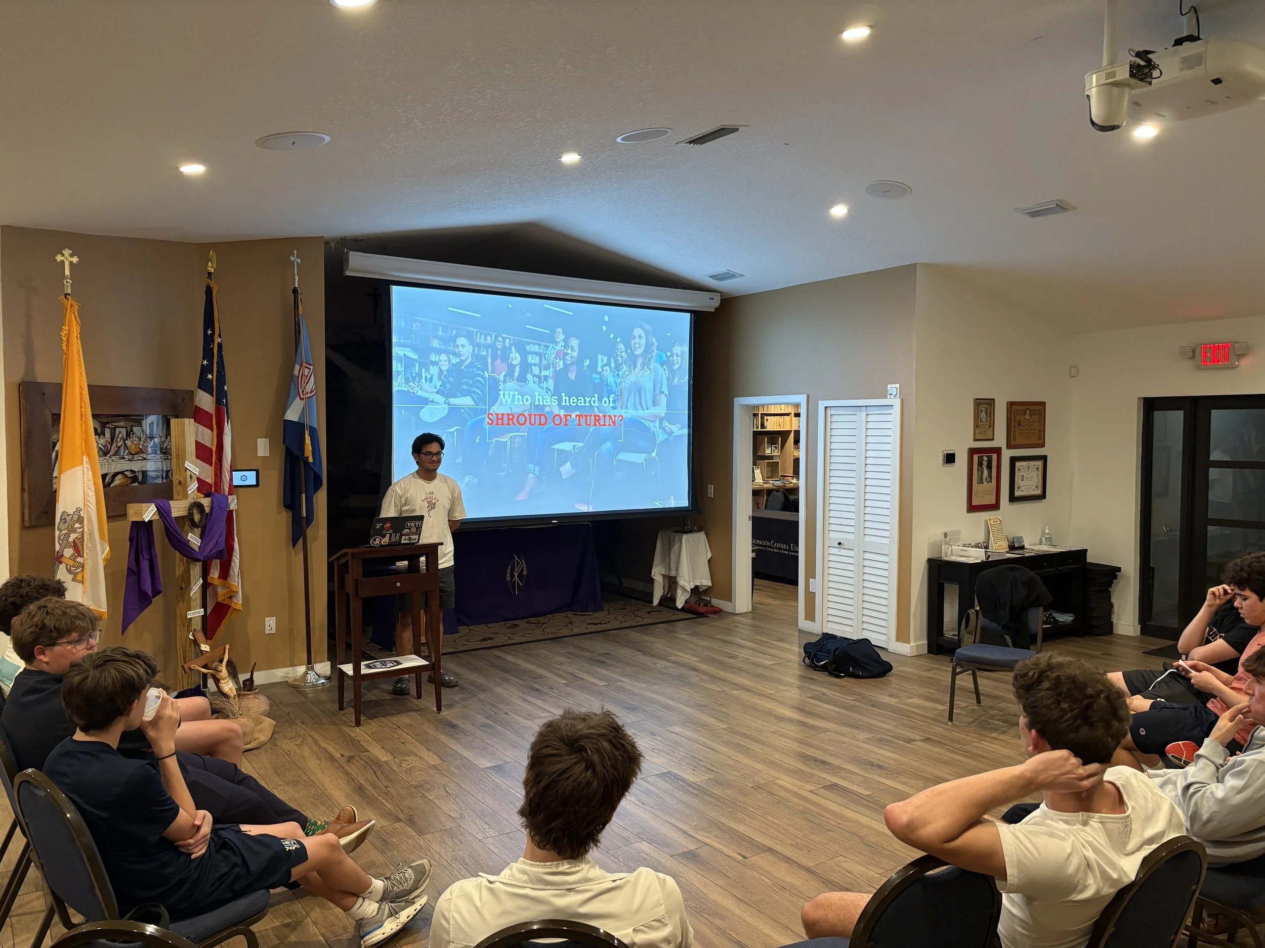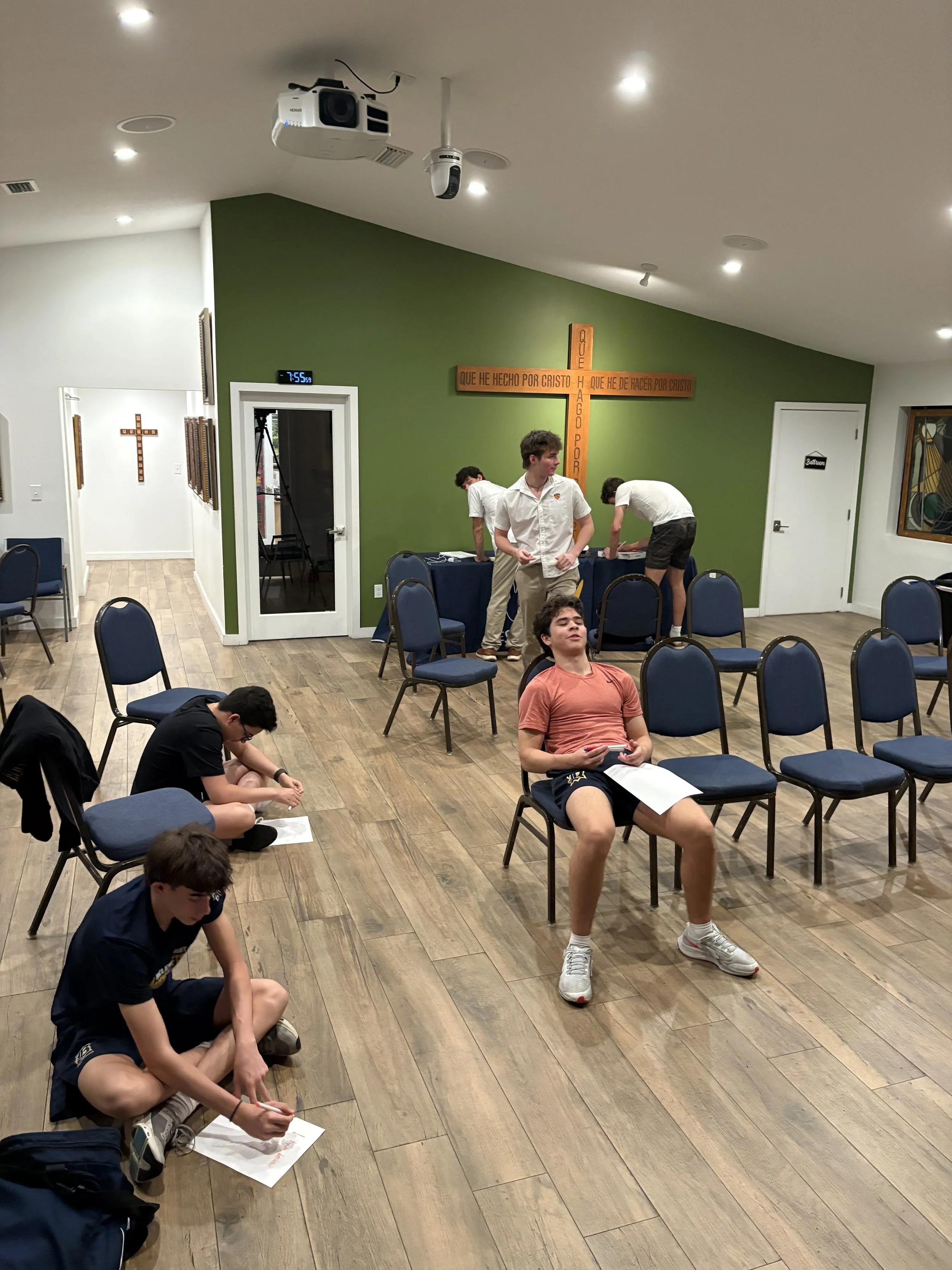 El pasado lunes 30 de marzo de 2026, los miembros del Grupo Esto Vir celebraron la sexta reunión general del semestre de primavera de 2026. El Grupo continuó su formación cuaresmal y dialogó sobre la resurrección y la Sábana Santa de Turín. La presentación estuvo a cargo de Noah Scott, estudiante de último año, quien fue admitido en la Universidad Estatal de Florida. Como parte de la reunión, los estudiantes llenaron 500 huevos de Pascua para los niños en la Misa de Pascua de la ACU el domingo. Los estudiantes también participaron en una actividad de reflexión donde escribieron algo que aprendieron sobre sí mismos durante la Cuaresma y cómo pueden usarlo para crecer en su relación con el Señor. Al final de la noche, los estudiantes encendieron una fogata. Los moderadores del grupo son los congregantes Jay Velasco y Erik Vieira.