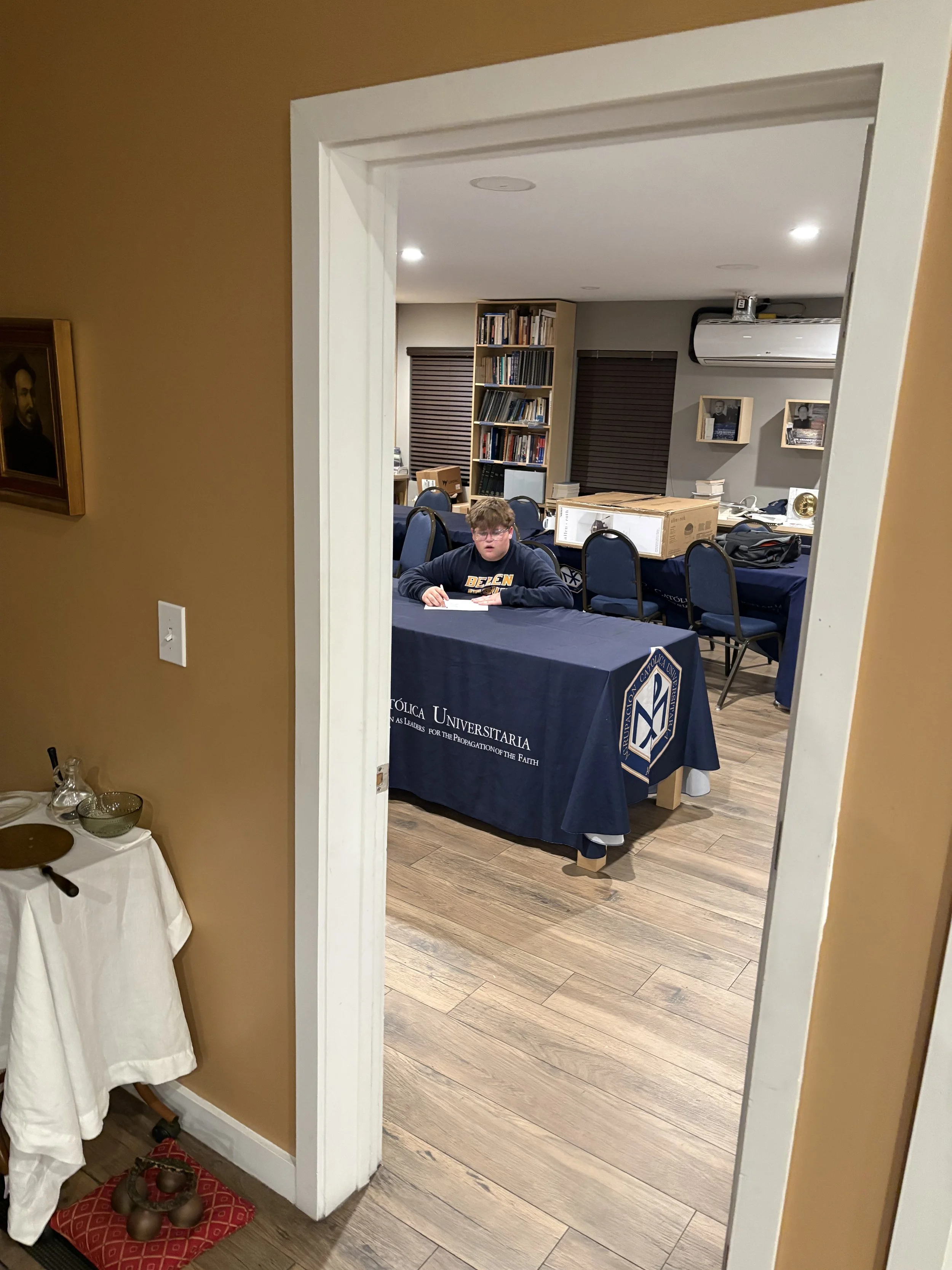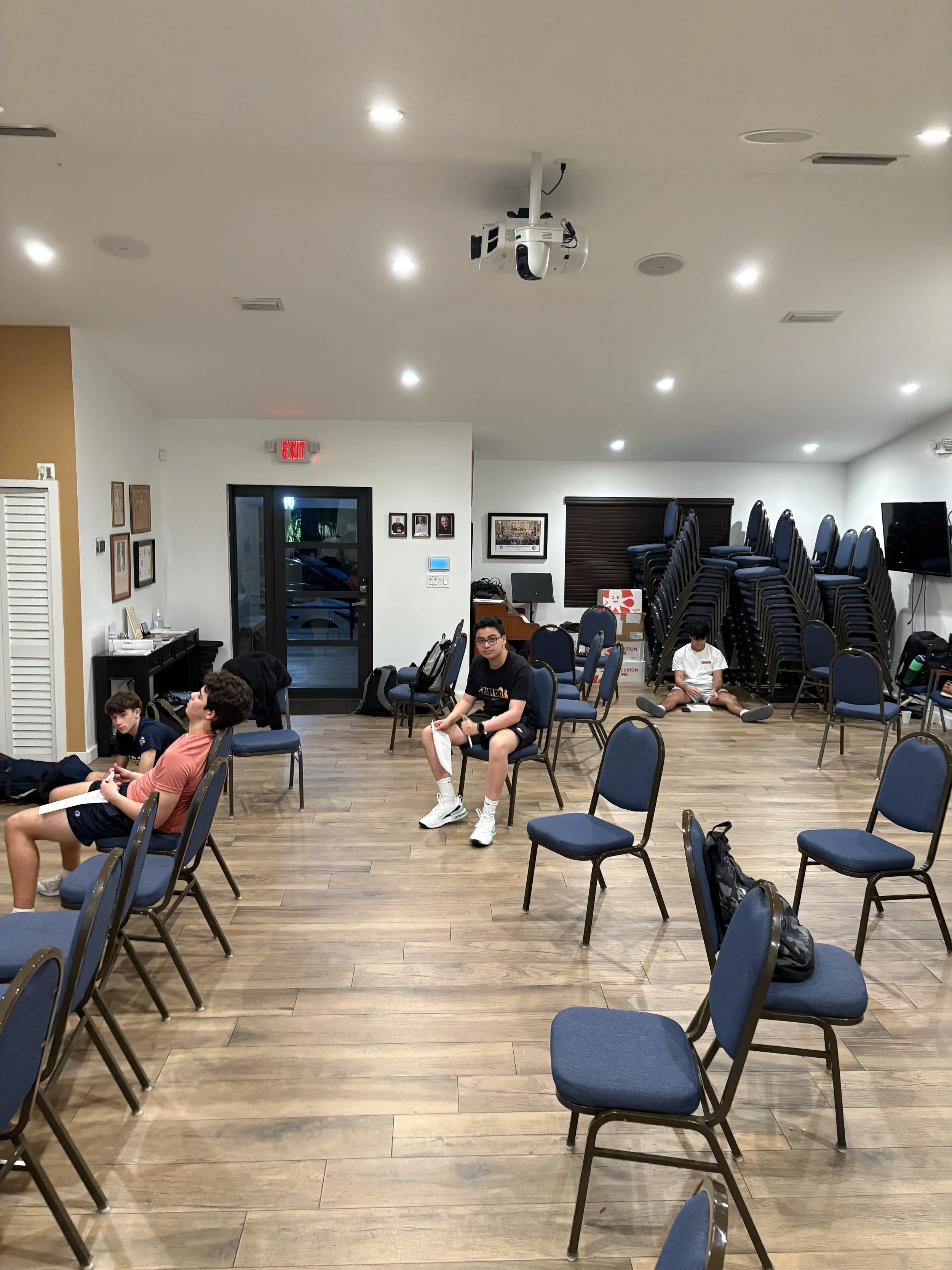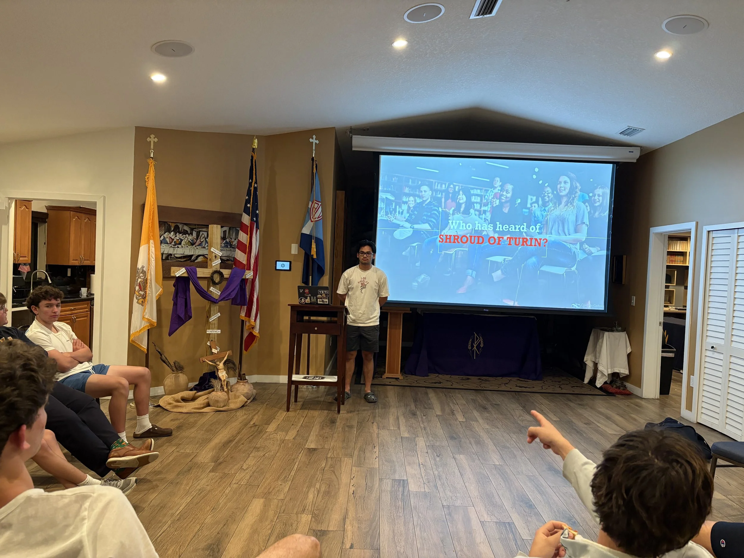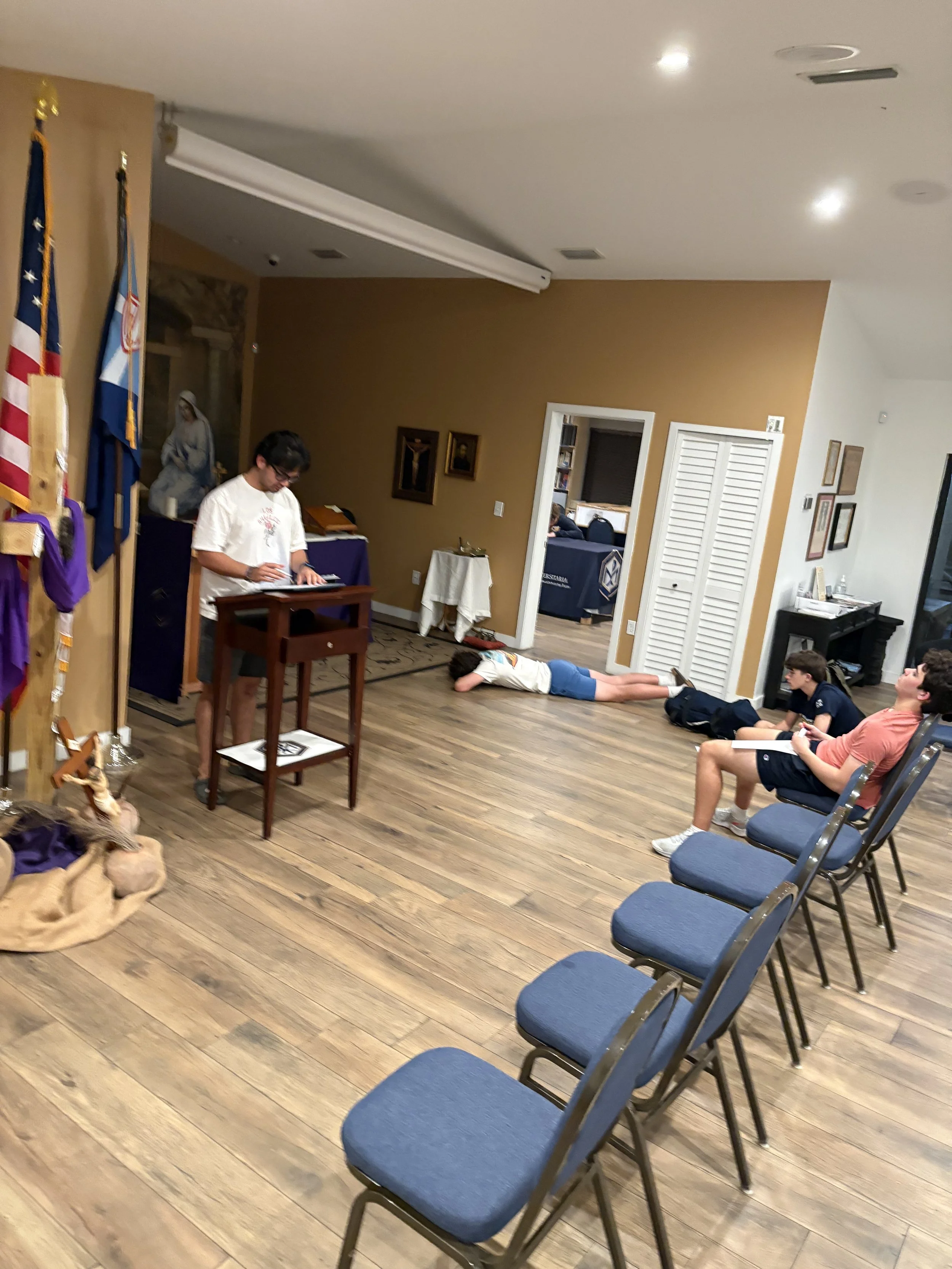 El pasado lunes 30 de marzo de 2026, los miembros del Grupo Esto Vir celebraron la sexta reunión general del semestre de primavera de 2026. El Grupo continuó su formación cuaresmal y dialogó sobre la resurrección y la Sábana Santa de Turín. La presentación estuvo a cargo de Noah Scott, estudiante de último año, quien fue admitido en la Universidad Estatal de Florida. Como parte de la reunión, los estudiantes llenaron 500 huevos de Pascua para los niños en la Misa de Pascua de la ACU el domingo. Los estudiantes también participaron en una actividad de reflexión donde escribieron algo que aprendieron sobre sí mismos durante la Cuaresma y cómo pueden usarlo para crecer en su relación con el Señor. Al final de la noche, los estudiantes encendieron una fogata. Los moderadores del grupo son los congregantes Jay Velasco y Erik Vieira.