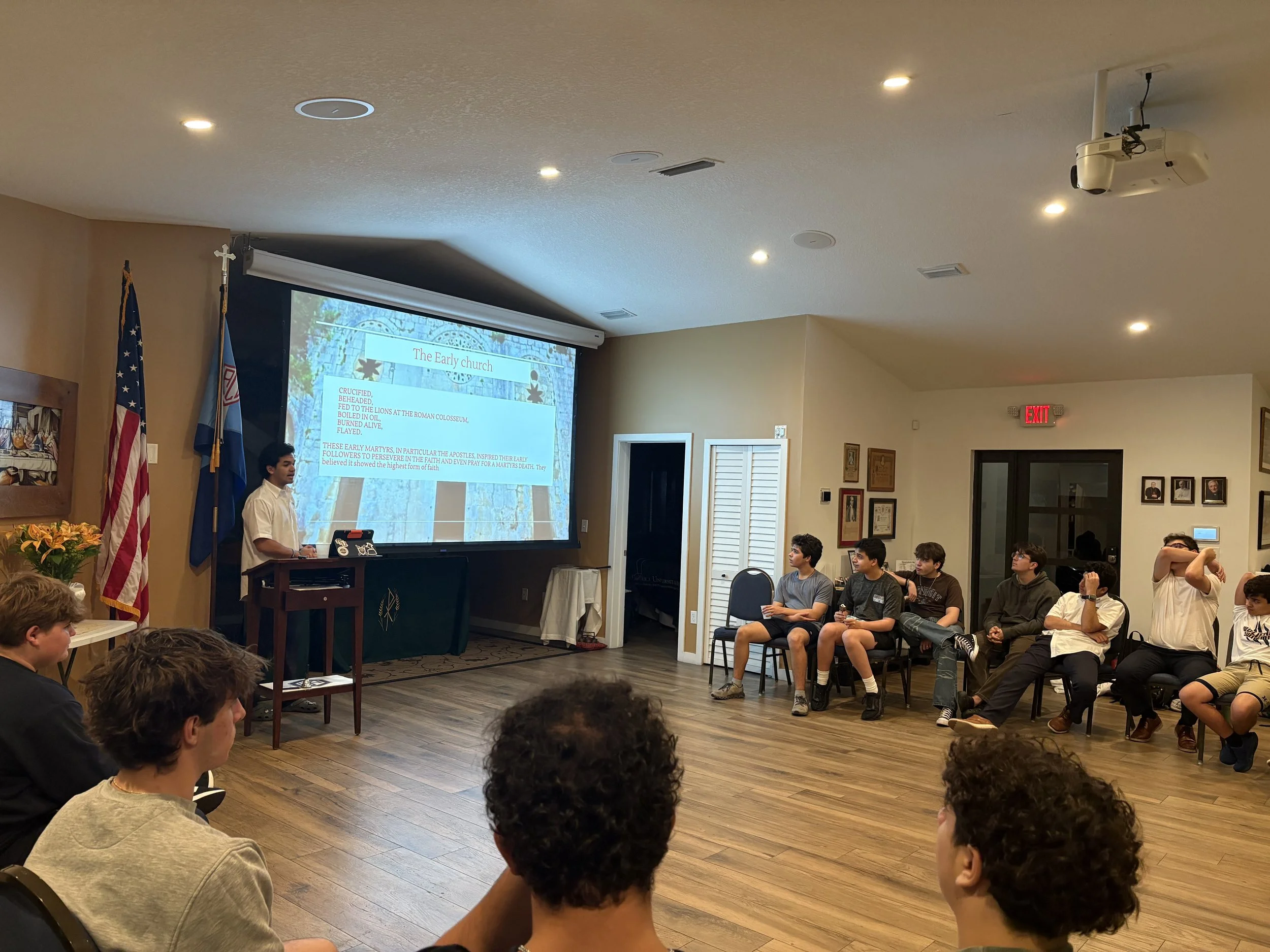 This past Wednesday, November 19, 2025, the members of the Esto Vir Group for the Miami Chapter held their seventh general meeting of the Fall semester for the 2025-2026 academic year. The presentation was led by Noah Scott, a senior at Belen. The presentation centered on the lives and martyrdom of the Apostles, and included a brief history of Roman religious cults and the relationship between Israel and Rome. Noah also held a discussion on how teenager can manifest the courage of the Martyrs to live out their faith in the fullest expression. Some specific topics included attending Mass regularly, avoiding illicit behavior in social situations, refraining from porn, seeking proactive opportunities to promote pro-life positions, and properly managing romantic relationships with women. The moderators for the group are Congregants Jay Velasco and Erik Vieira.