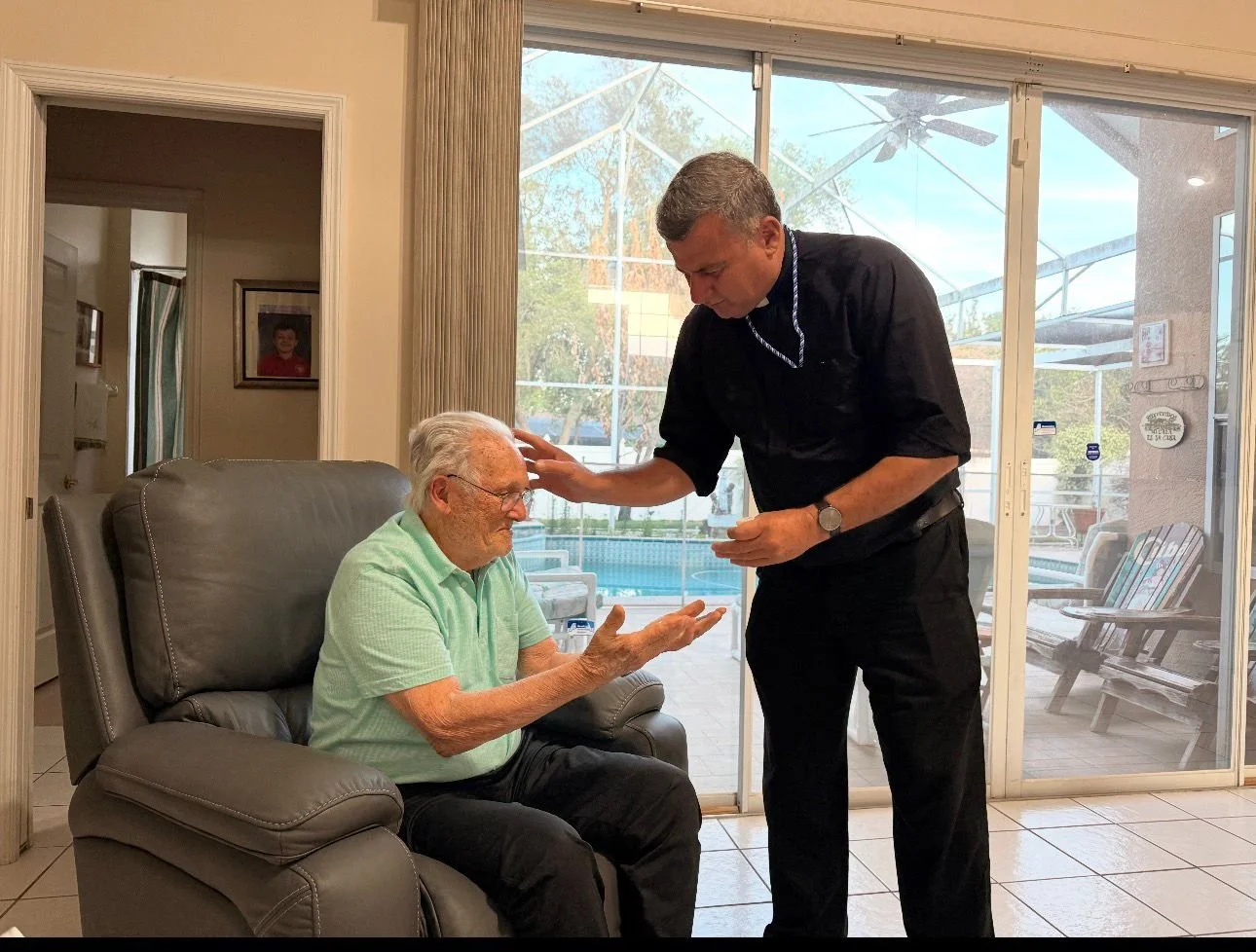 This past weekend, our Director, Fr. Jorge Luis Rojas, S.J., was accompanied by our President, Dr. Manny Antón, and our Vice-President, Mariano Perez, to Orlando to meet with the Agrupados and families marking the first pastoral visit to the restored Orlando ACU group in decades. Agrupados Gene Rodriguez and Rafael (Wifo) de Cardenas have been leading the resurgence of the ACU in Orlando and have held several meetings for instrucciones and círculos de estudio over the past few months. Part of the pastoral visit included meeting with the past president of the ACU in Orlando, Cesar "Monono" Baro, who is 95 years old. Monono's pase de Congregante was on December 8, 1950. Fr. Rojas was particularly excited about the visit because Monono is one of the few congregants who spent time with the ACU Founder, Fr. Felipe Rey de Castro, S.J. Monono shared numerous stories about Fr. Rey with Fr. Rojas. After an exchange of stories and history, Fr. Rojas administered the Anointing of the Sick and Holy Communion. That evening the group had dinner with several Orlando Congregants and the young members of the formation group, which include two recent Belen graduates who were part of the Esto Vir Group in Miami. Sunday morning there was a mass and luncheon at the home of Gene Rodriguez. Fr. Rojas was the main celebrant of the Mass, which was attended by the original Orlando congregantes of various generations, their families, and the young men participating in the formation group. Please keep this resurgence in your prayers. May Our Lord continue to inspire the Agrupados in Orlando to fulfill the mission and may the young men in formation persevere with the intercession of Our Blessed Mother.