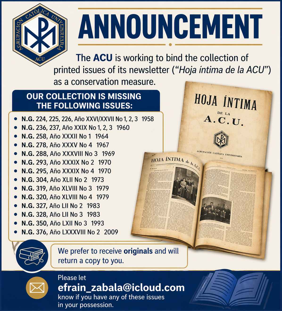 Preserving Our Legacy: Help Complete the ACU Newsletter Collection Apr 24 Written By Agrupación Católica Universitaria View fullsize Agrupación Católica Universitaria https://estovir.org/