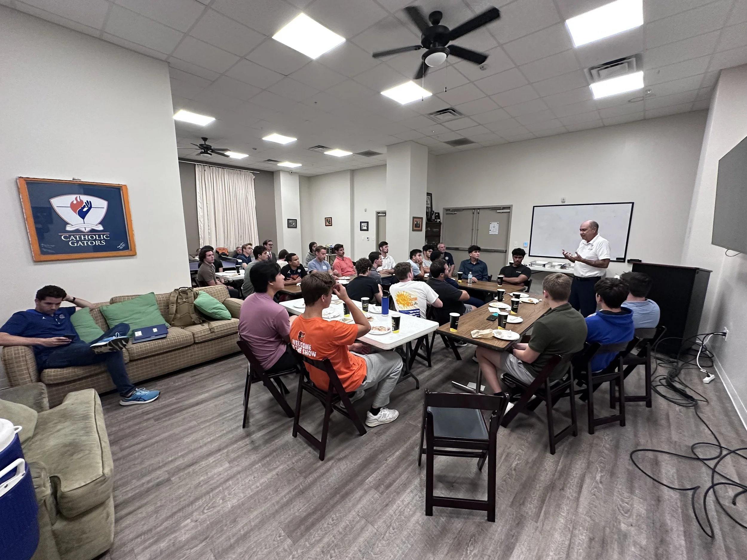 El equipo del Capítulo de Miami viajó a Gainesville, Florida, el pasado lunes 29 de septiembre para la primera reunión con el grupo de hombres del ministerio de los Gators Católicos de la Universidad de Florida. Andrés Manrara, Gerry Portela, Jay Velasco y Gerry Fernández estuvieron acompañados por el congregante Ernie León. Se reunieron con aproximadamente 30 hombres para recibir instrucción sobre los principios y fundamentos de la espiritualidad ignaciana. A la mañana siguiente, el grupo recibió a algunos estudiantes para desayunar. El apostolado ha recibido permiso del P. Blair Gaynes, párroco, para proceder con el establecimiento de un aspirantado oficial y aumentar la frecuencia de las reuniones a dos veces al mes.